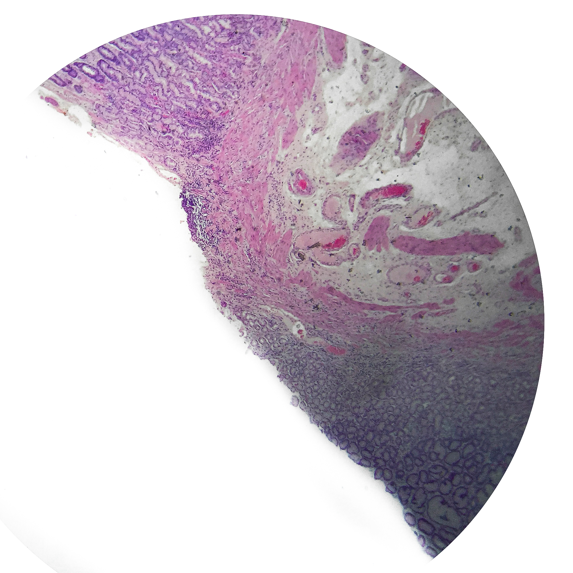 Densely staining amorphous necrotic tissue replacing mucosa with granulation tissue and fibrous tissue merging into submucosa
