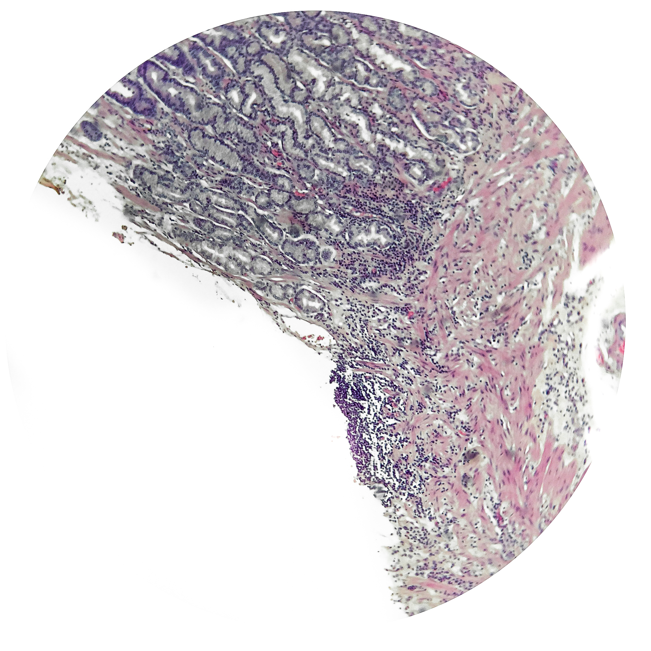 Muscularis Mucosae | smooth muscle fibres separated by oedema (fluid accumulation) and PMNs