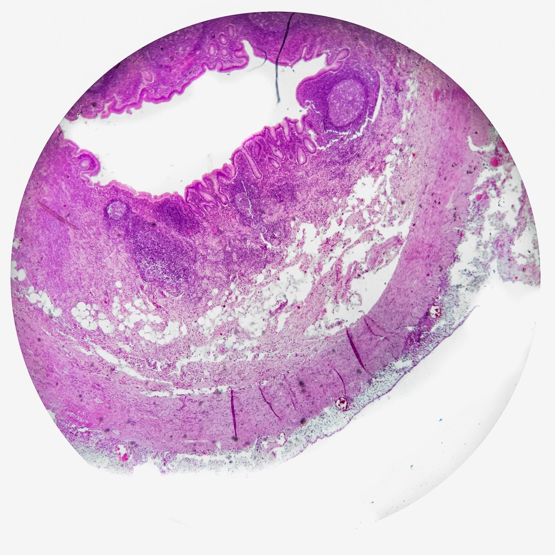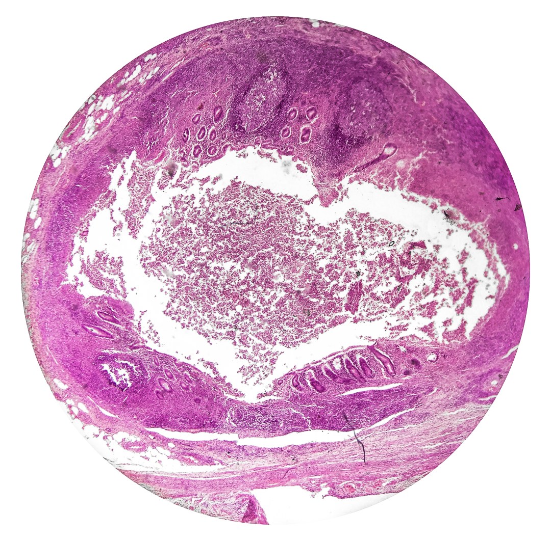 Rich in PMNs (pus formation) found throughout mucosa, submucosa, muscularis regions, and serosa regions