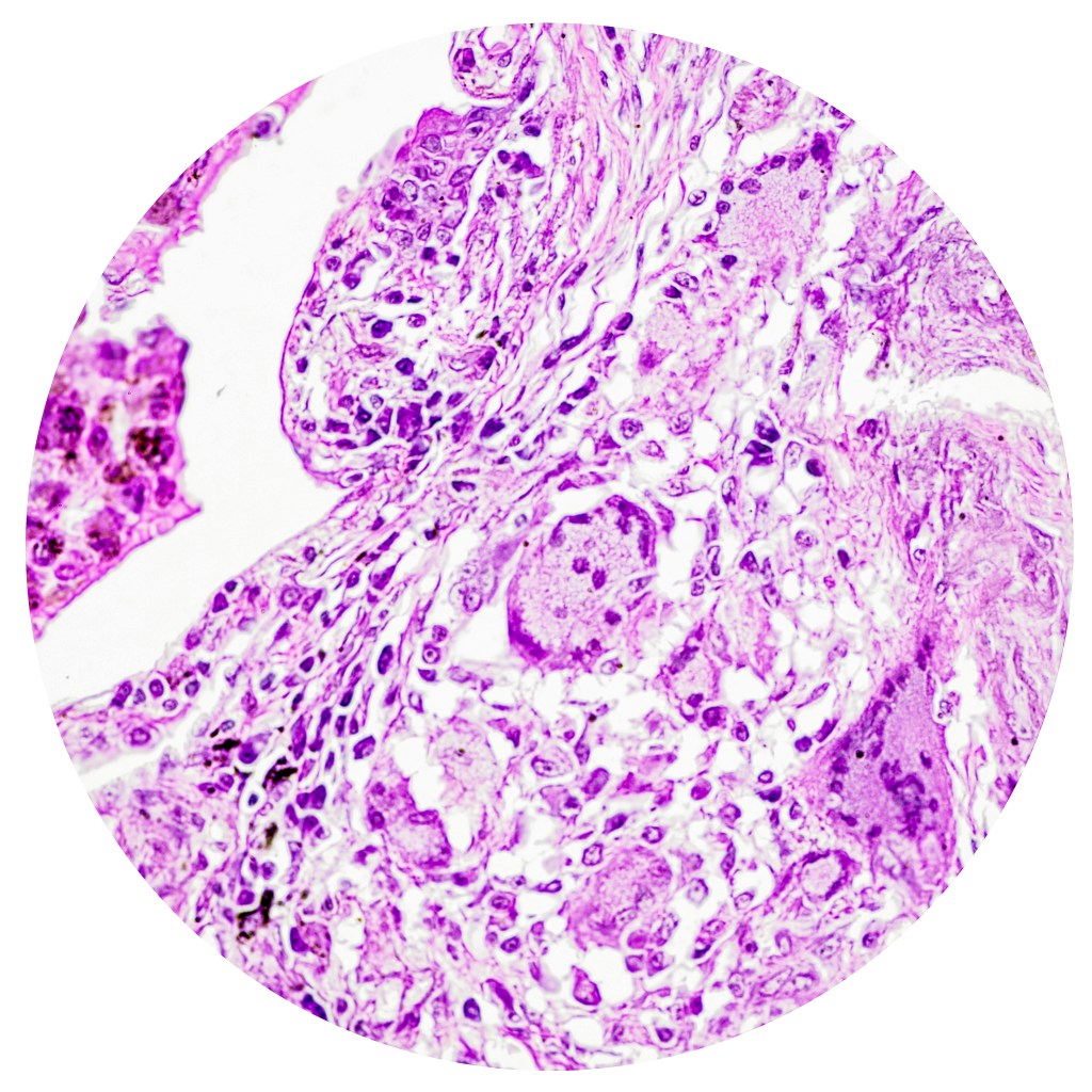 Foreign Body-Type Giant Cells | scattered nuclei throughout cell body